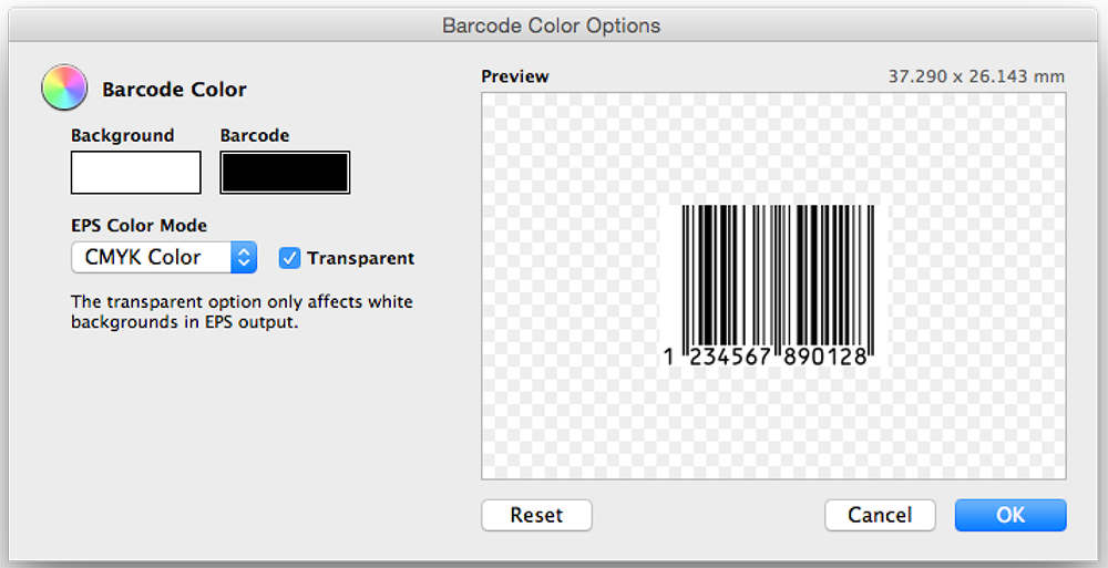 Colors can be specified in CMYK, RGB, or grayscale. Vector EPS output can be set to use any of these color modes. It is recommended that colors be specified using the same color mode as the EPS output to avoid any issues with color conversion. For example, if EPS Color Mode is set to "CMYK Color", specify the background and barcode colors using CMYK values.