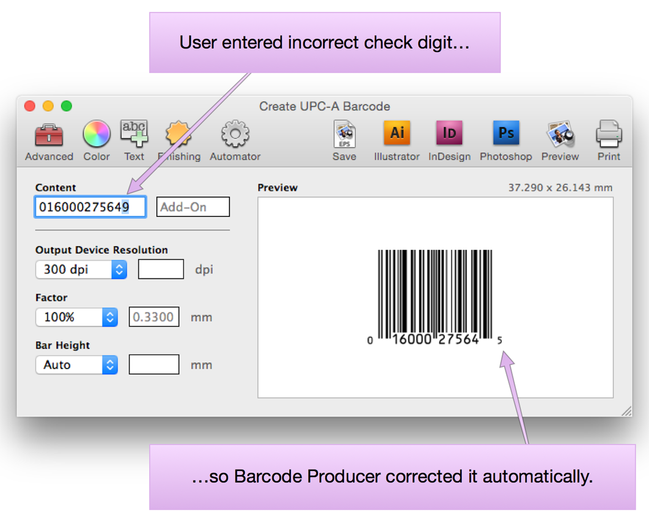 If you enter the wrong check digit, Barcode Producer will ignore your incorrect input and enter the correct check digit.