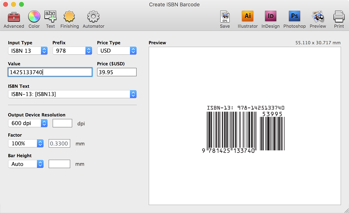 Each symbology is different, but many share the same basic options. As you customize your barcode, the Preview area immediately updates to reflect your changes.
